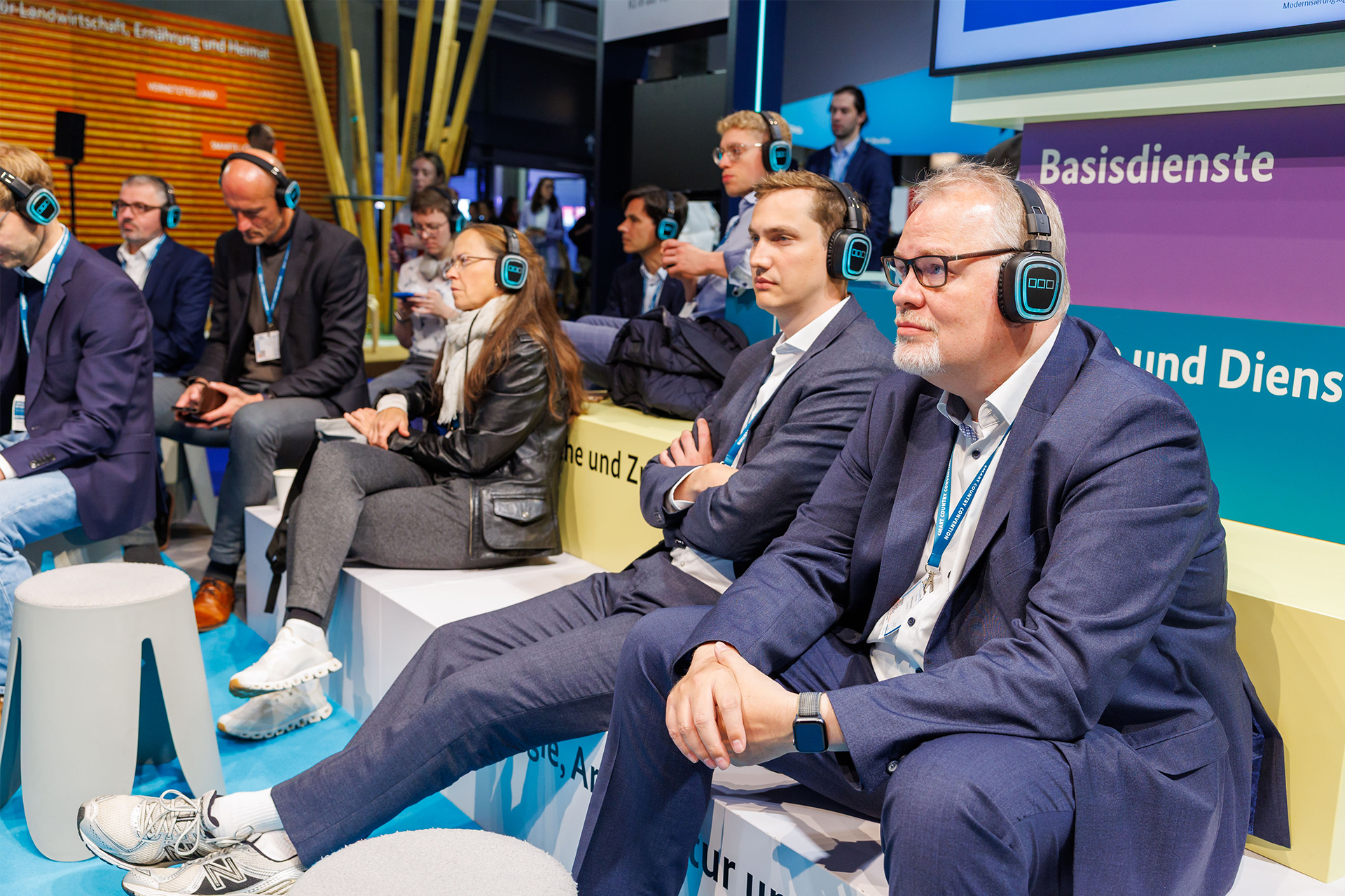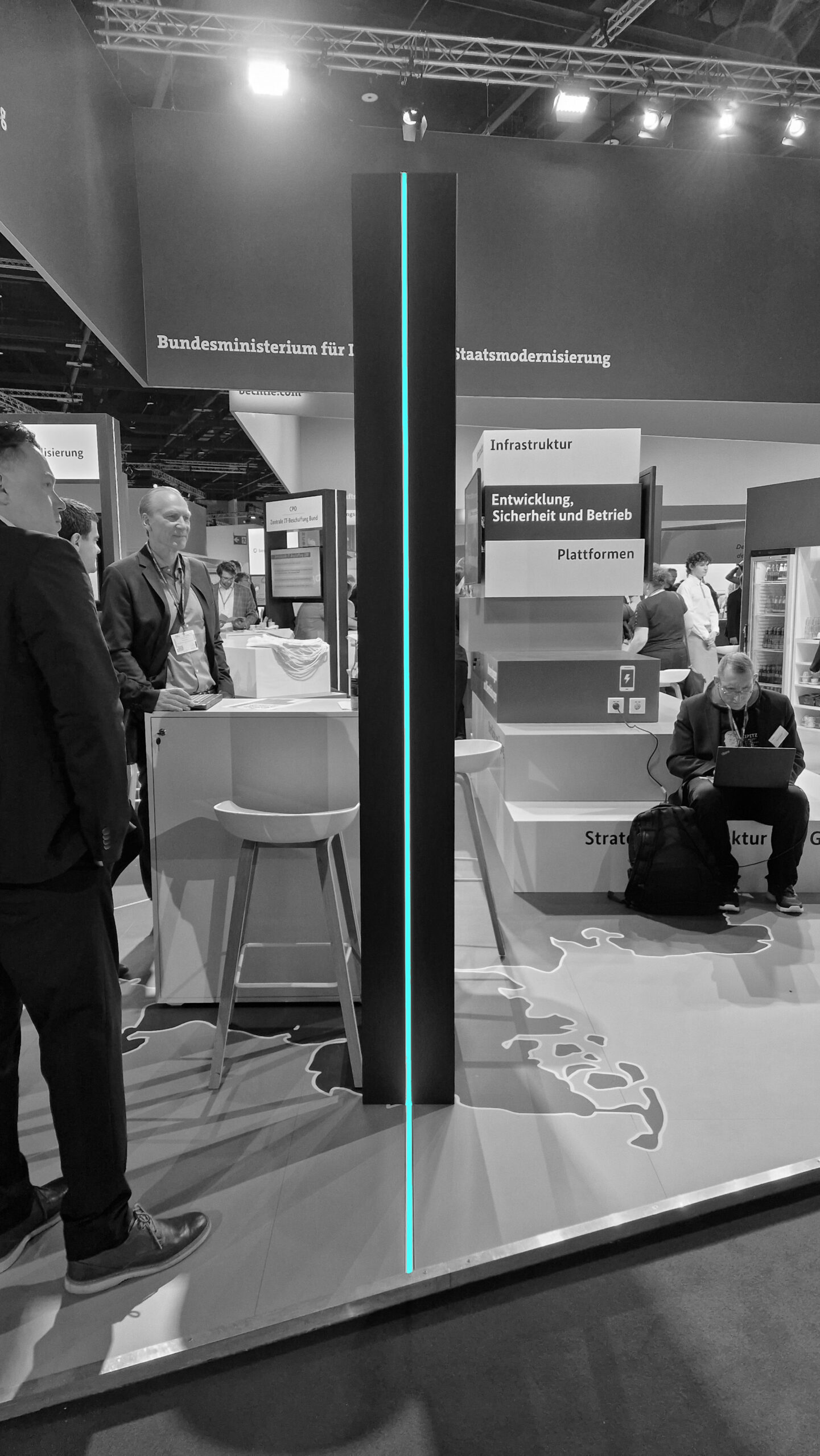 It is based on a central hub with two information desks and the “Deutschland Stack,” a sculptural representation of the ministry‘s central technology platform that functions as seating steps, an information tower, and an eye-catcher. Modular stations with touchscreens present the various stakeholders of the ministry around the hub. They are connected to the hub via glowing LED strips on the floor and invite visitors to communicate with the experts present. A stage with a silent conference system was used intensively without hindering the diverse communication options.